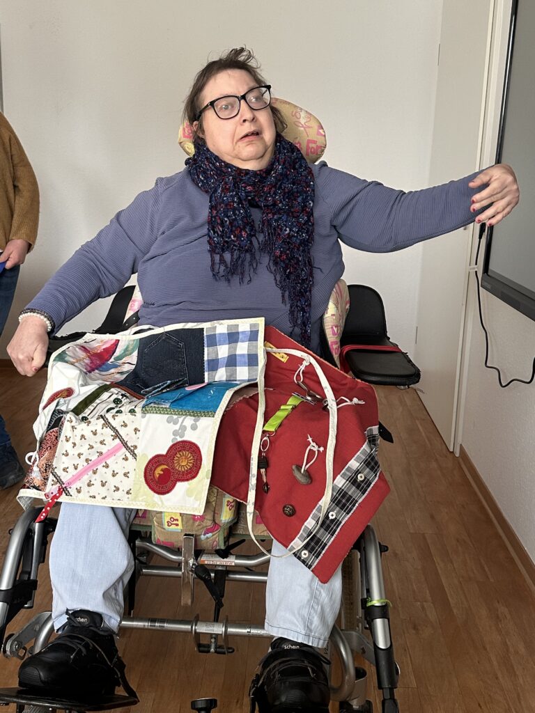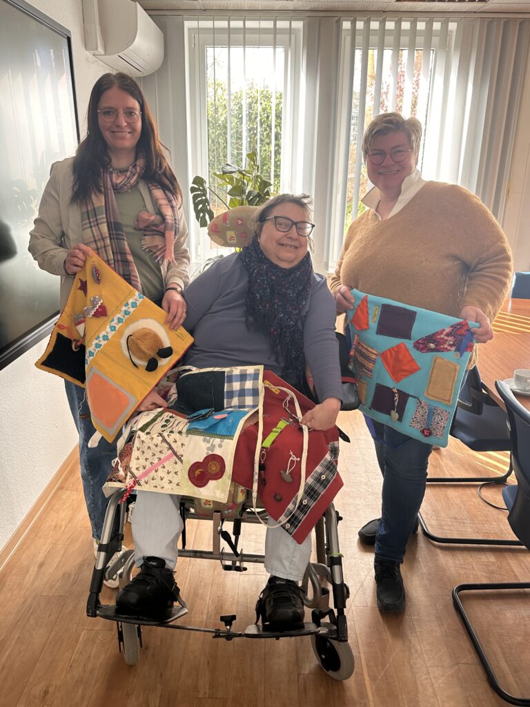 Die Bewohner*innen dürfen sich über neue Nesteldecken freuen, die LandFrauen aus dem Landkreis neu angefertigt haben. Hier zu sehen bei der Übergabe: DRK-Betreuerin, Bewohnerin Sabine und Adelheid Balthasar v.l.n.r.